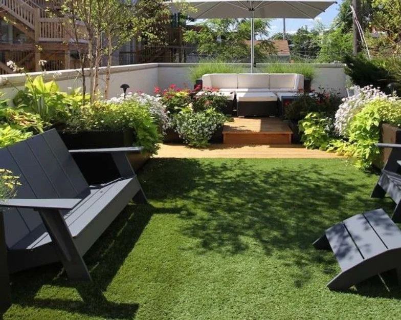Ý tưởng kết hợp thảm cỏ xanh trong sân vườn trên sân thượng là một ý tưởng đơn giản nhưng hiệu quả, giúp tạo ra một không gian xanh mát và thư giãn. Thảm cỏ xanh có thể giúp giảm tiếng ồn từ môi trường xung quanh, mang đến không gian yên tĩnh và thư thái.
